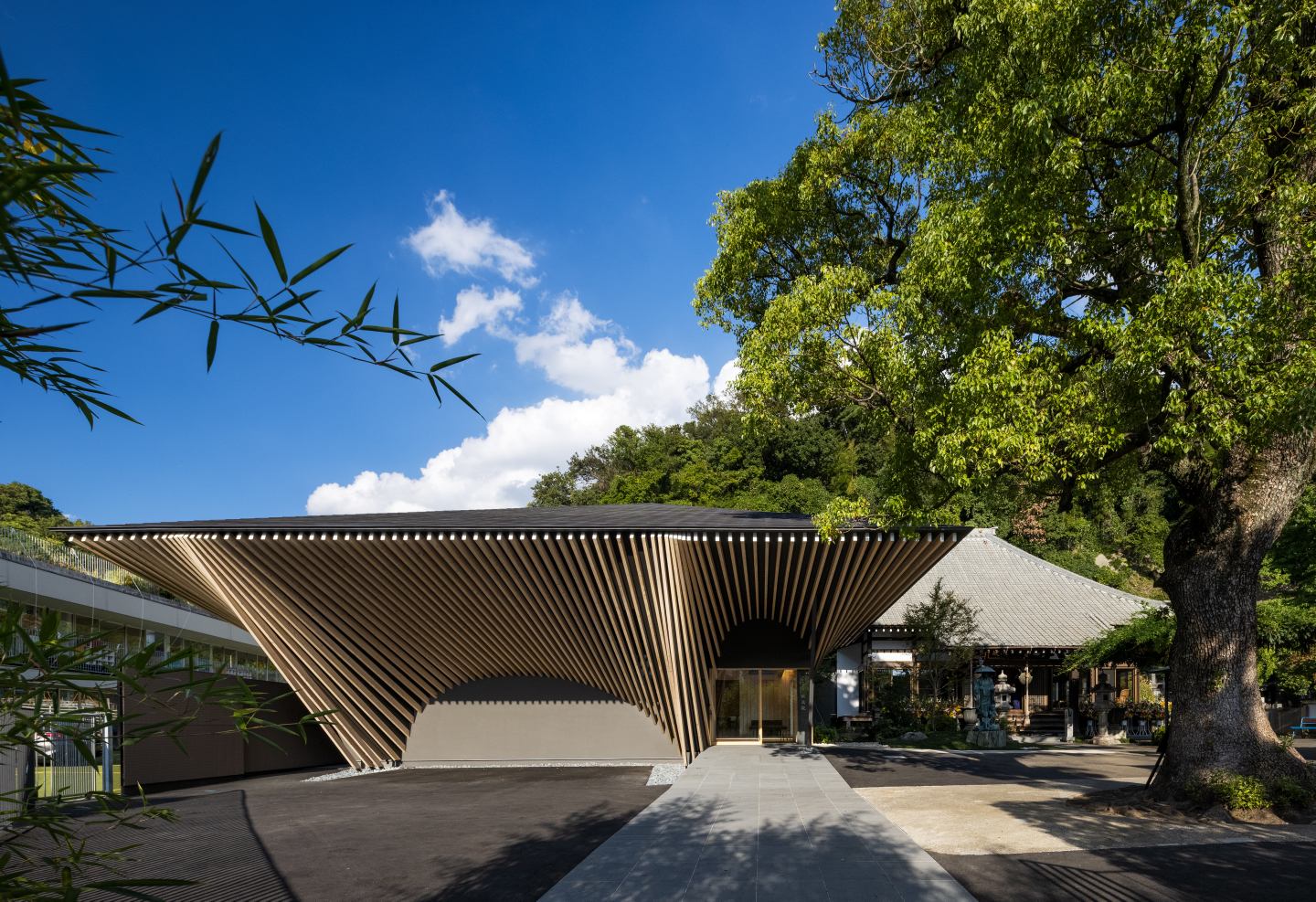 本堂は客殿新築に合わせ、令和4年にカーボンファイバー(炭素繊維)を用いる最新工法にて耐震補強工事完了。(設計・監理 隈研吾建築都市設計事務所、江尻建築構造設計事務所)