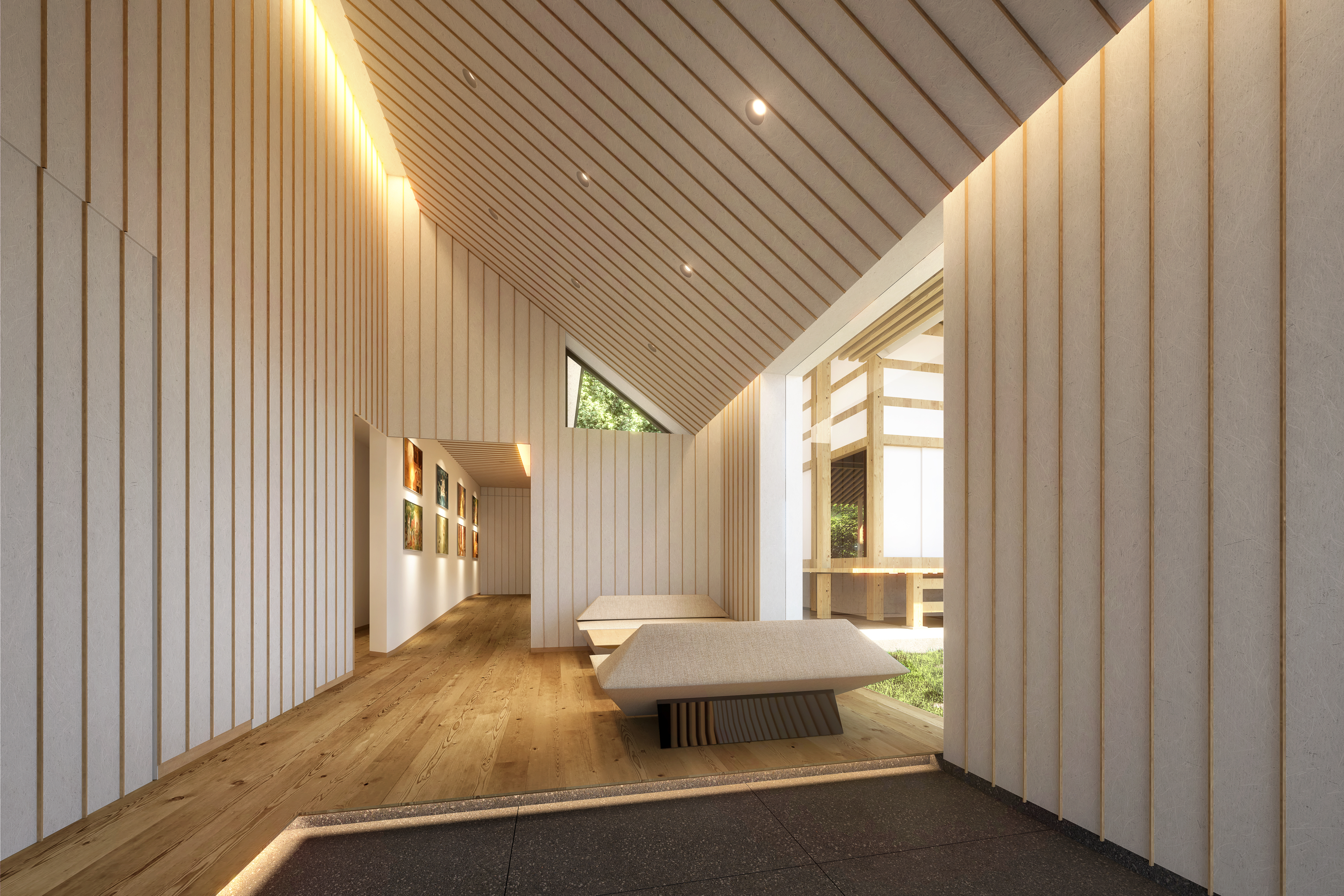 上記の建築に合わせ、エントランス前に前庭、本堂と客殿の間に後庭を設けるなど、境内の庭園設計を著名な庭園の設計施工をされている株式会社岩城に依頼しました。また当院の敷地は緑地保全地区に指定されており、一定以上の緑化が条件になっている為、建物周辺部や建築敷地内に緑化の計画をしております。それらは岩城造園と隈研吾氏の共同設計として進めております。